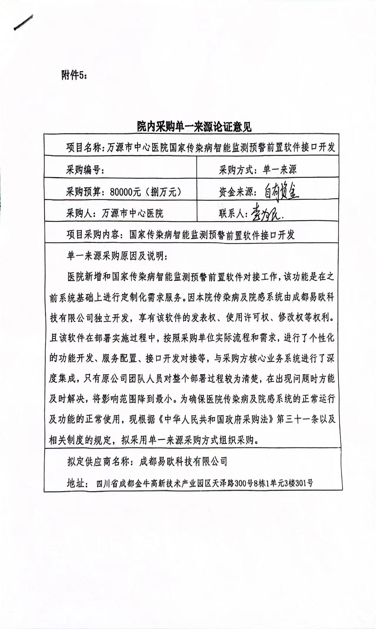 采用单一来源采购方式的原因及说明: 医院新增和国家传染病智能监测预警前置软件对接工作,该功能是在之前系统基础上进行定制化需求服务。因本院传染病及院感系统由成都易欧科技有限公司独立开发,享有该软件的发表权、使用许可权、修改权等权利且该软件在部署实施过程中,按照采购单位实际流程和需求,进行了个性化的功能开发、服务配置、接口开发对接等,与采购方核心业务系统进行了深度集成,只有原公司团队人员对整个部署过程较为清楚,在出现问题时方能及时解决,将影响范围降到最小。为确保医院传染病及院感系统的正常运行及功能的正常使用,现根据《中华人民共和国政府采购法》第三十一条以及相关制度的规定,拟采用单一来源采购方式组织采购。